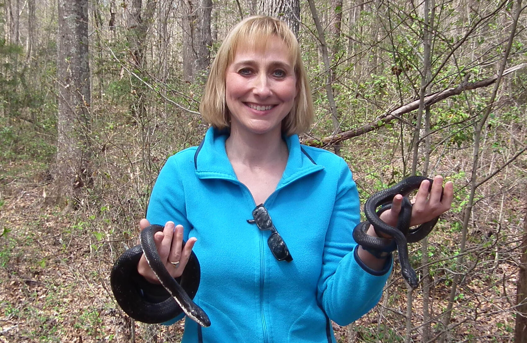 Joy working with venomous snakes in the field with the Copperhead Institute